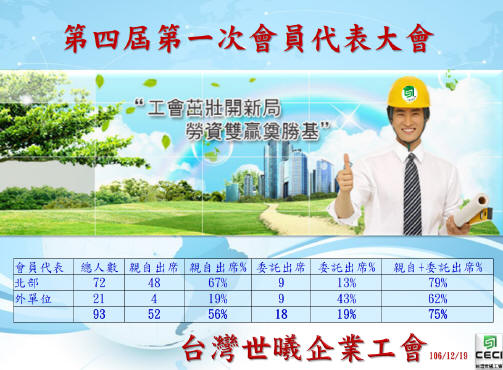 感謝第四屆會員代表撥空參與本次勞工代表大會,本次會議出席率超越以往高達75%,期望您持續關注及扶持工會發展。
